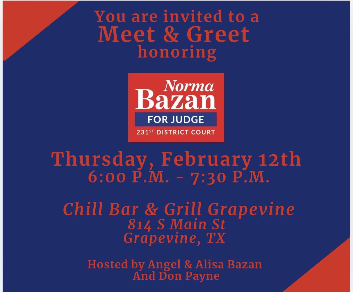 Come meet Norma Bazan, conservative candidate for the 231st District Court. Hosted by Angel & Alisa Bazan and Don Payne