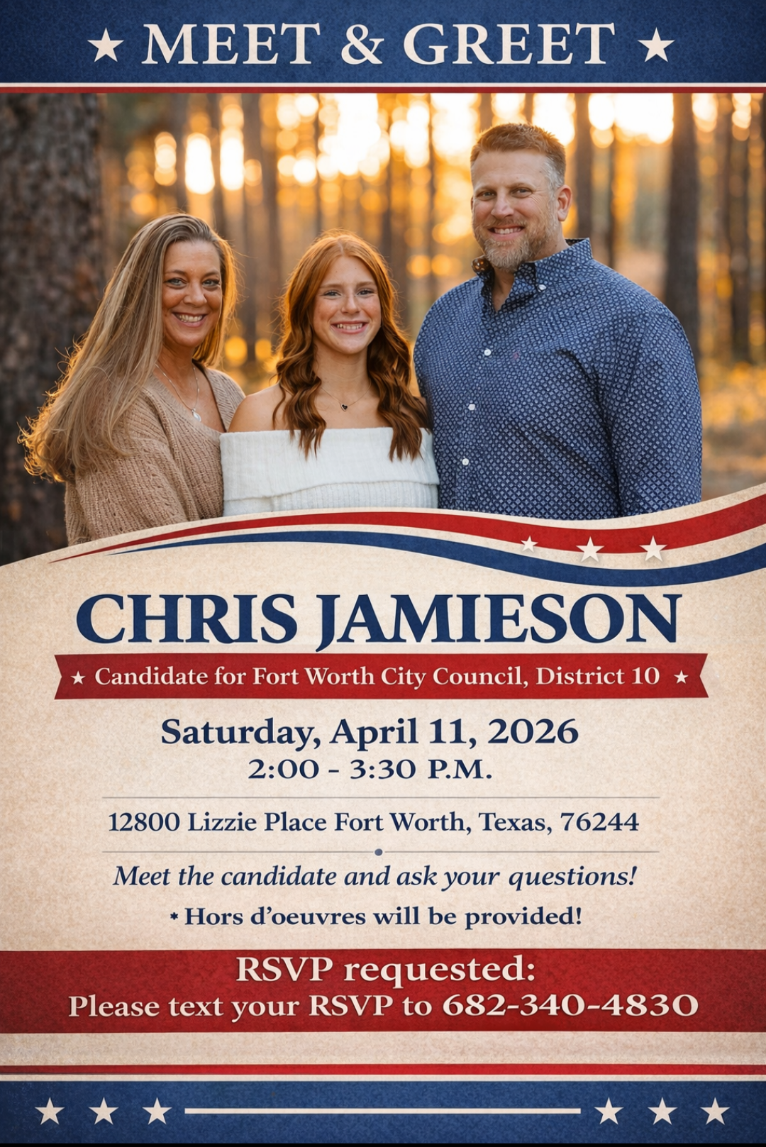 Meet candidate for Fort Worth City Council, District 10, Chris Jamieson. Hors d'oeuvres will be provided. RSVP REQUESTED: TEXT TO 682-340-4830